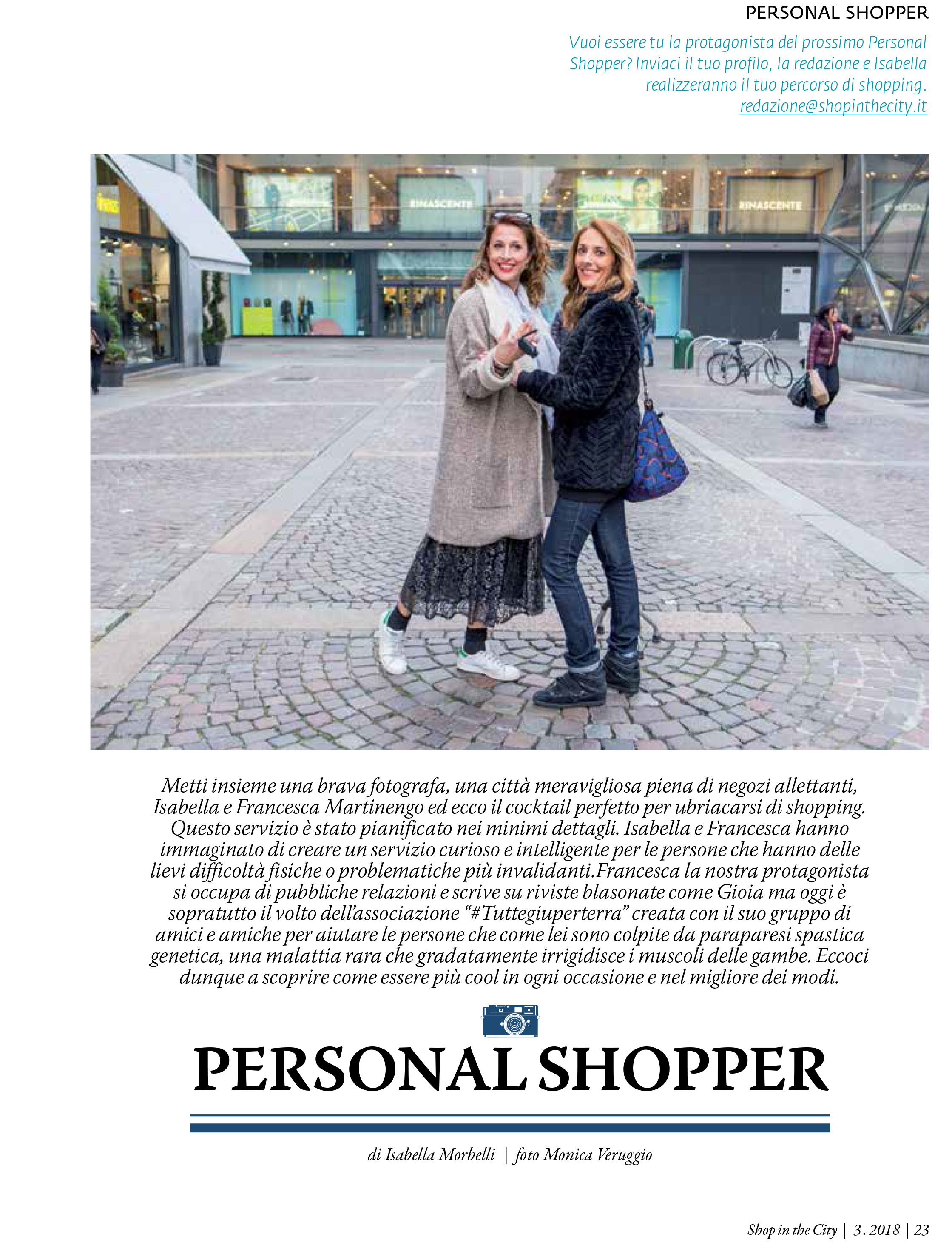 Metti insieme una brava fotografa, una città meravigliosa piena di negozi allettanti, Isabella e Francesca ed ecco il cocktail perfetto per ubriacarsi di shopping…Questo servizio è stato pianificato nei minimi dettagli. Isabella e Francesca hanno immaginato di creare un servizio curioso e intelligente per le persone che hanno delle lievi difficoltà fisiche o problematiche più invalidanti. Francesca la nostra protagonista si occupa di pubbliche relazioni e scrive su riviste blasonate come Gioia ma oggi soprattutto è il volto dell’Associazione #Tuttegiuperterra da lei fondata per aiutare le persone che come lei sono colpite da paraparesi spastica genetica…continua a leggere l’articolo sfogliando la gallery